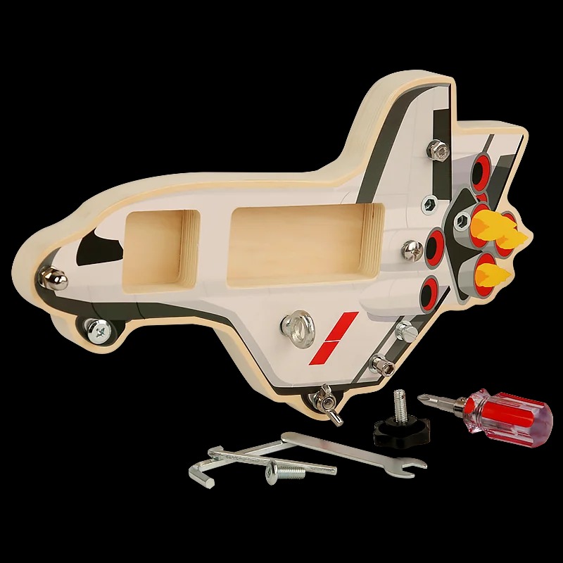 A készlet igazi csavarhúzót és különböző méretű csavarokat tartalmaz, amelyek biztonságosan használhatók és tökéletesen illeszkednek a kis kezekbe. Az űrrepülő hajtóművei forgatható elemek, ami extra játéklehetőséget biztosít. A Montessori elvek szerint a gyerekek cselekvés közben tanulnak a legjobban!